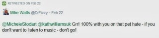 I've pretty much given up going to concerts because of the other members of the audience talking, texting, checking their email, filming etc. Seated venues eg Hexagon, Wycombe Swan, RFH, RAH are OK, but my last trips to the Borderline and O2 were grim.