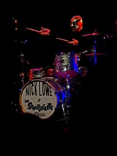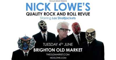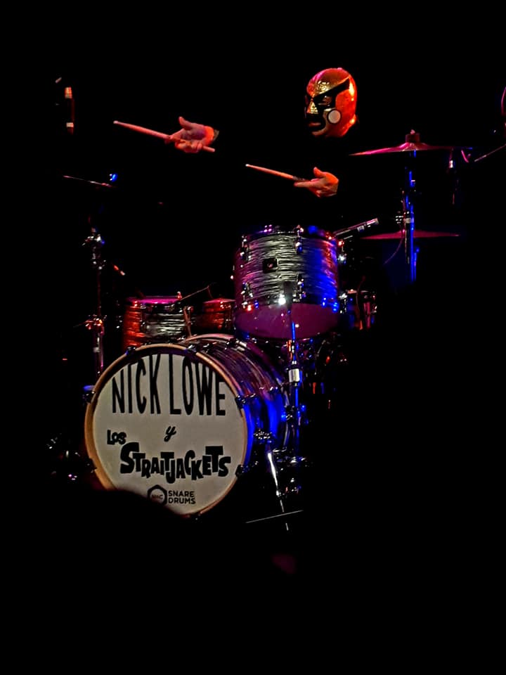 ‘I think there will be something in our repertoire tonight to satisfy even the most jaded of audience members, including those who might only recognise one or two song – probably sung by someone else’ grins new septegenarian Nick Drain Lowe from the low stage of the Brighton Old Market. Despite being many years down the rock n roll road he appears to still be having a whale of a time. Backed by surf garage band Los Straitjackets in their Mexiacan wrestler garb he’s already given his his initial solo statement ‘So It Goes’ (BUY1), ‘Ragin’ Eyes’ and ‘Without Love’ with an effortless grace and cool.